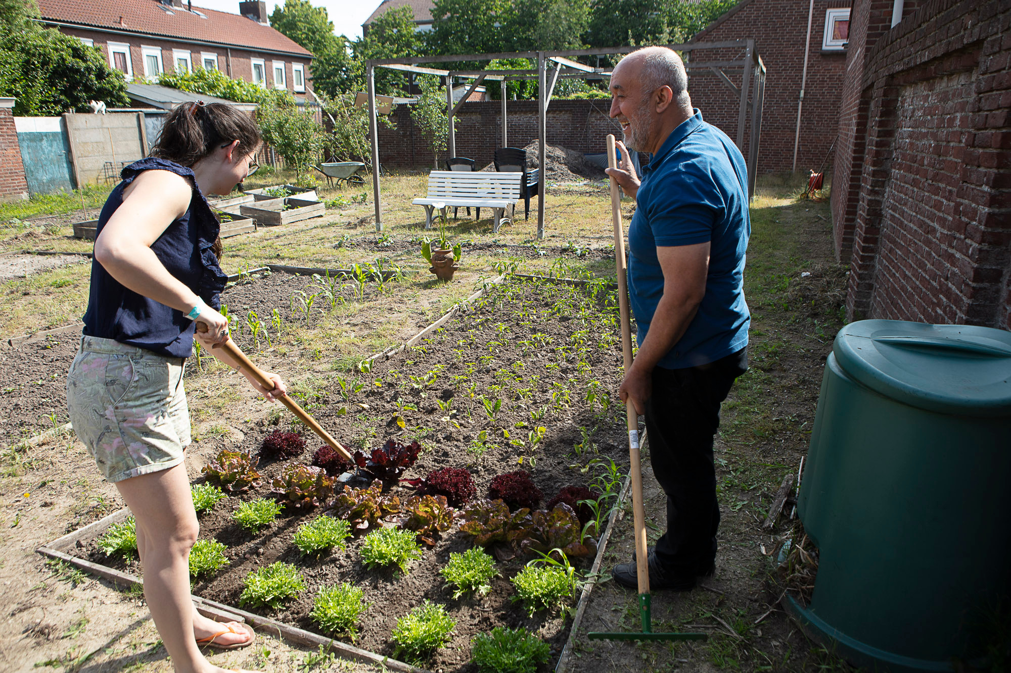 Julia Lozar (huurder Wonen BreBurg) en Ahmet Cöl (huurder Alwel) voelen zich de koning te rijk met hun moestuin aan de Swammerdamstraat in de wijk Liniekwartier in Breda. Samen met nog enkele andere buurtbewoners wroeten ze regelmatig in de aarde om de jonge plantjes te laten groeien.