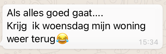 In de laatste week appt Maria: ''De kozijnen zijn vervangen en het eerste raam is al weer gewassen en de eerste stroken stucloop zijn de deur al uit. Afgelopen week de lak, latex en behang besteld. Dat zijn weer goede vooruitzichten. Als alles goed gaat…krijg ik woensdag mijn woning terug.''