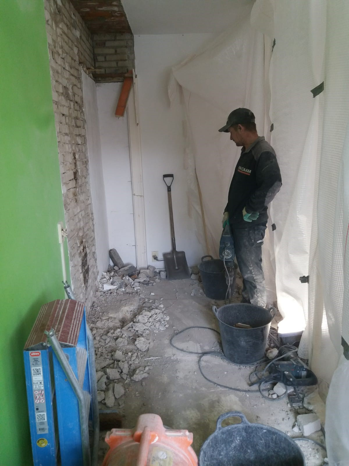 ''Ik sta om half zeven op, zodat ik om half acht niet meer in de weg loop. Ik ga om 8.15 uur naar mijn werk zodat ik het boren niet hoef te horen. De sleuven in de douche zijn gedaan en het vloertje is eruit. Bij thuiskomst is alles rustig en ik kan gelukkig nog koken.''