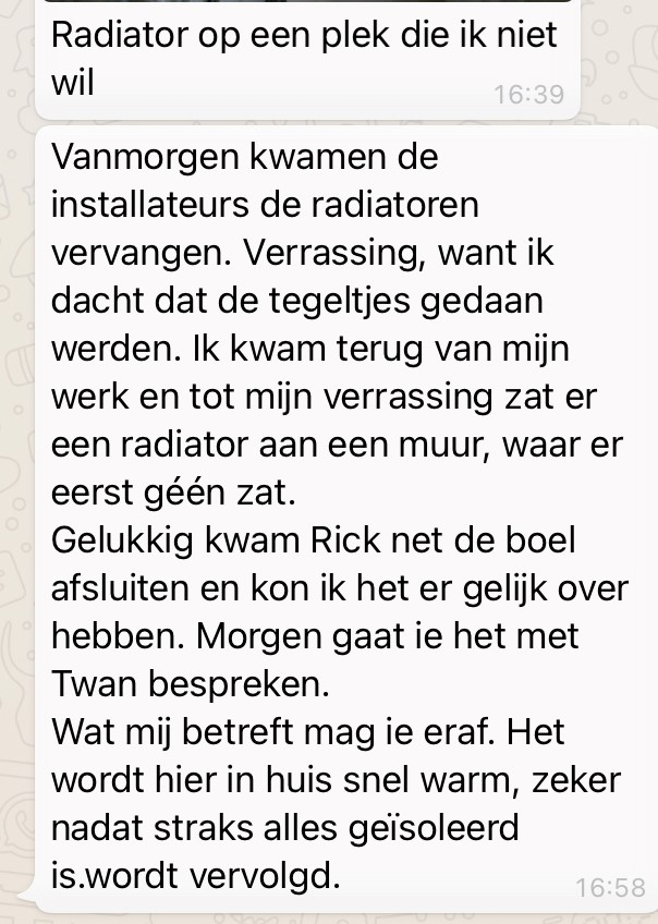 Maria Prinse woont ruim haar halve leven in de Bredase buurt Linie-Zuid. Haar appartement uit de jaren 50 was hard aan een renovatie toe. Alwel maakt samen met Zwaluwe Bouw de woning energiezuinig en sluit deze aan op het warmtenet. Ook kreeg Maria een nieuwe keuken, toilet en doucheruimte. Een ingrijpende klus. Hoe beleeft een bewoner dit nu echt? Maria heeft van dag tot dag verslag gedaan via WhatsApp. Dat hebben we via Facebook gedeeld. In dit verhaal lees je haar hoogte-en dieptepunten tijdens de 5 weken renovatie.