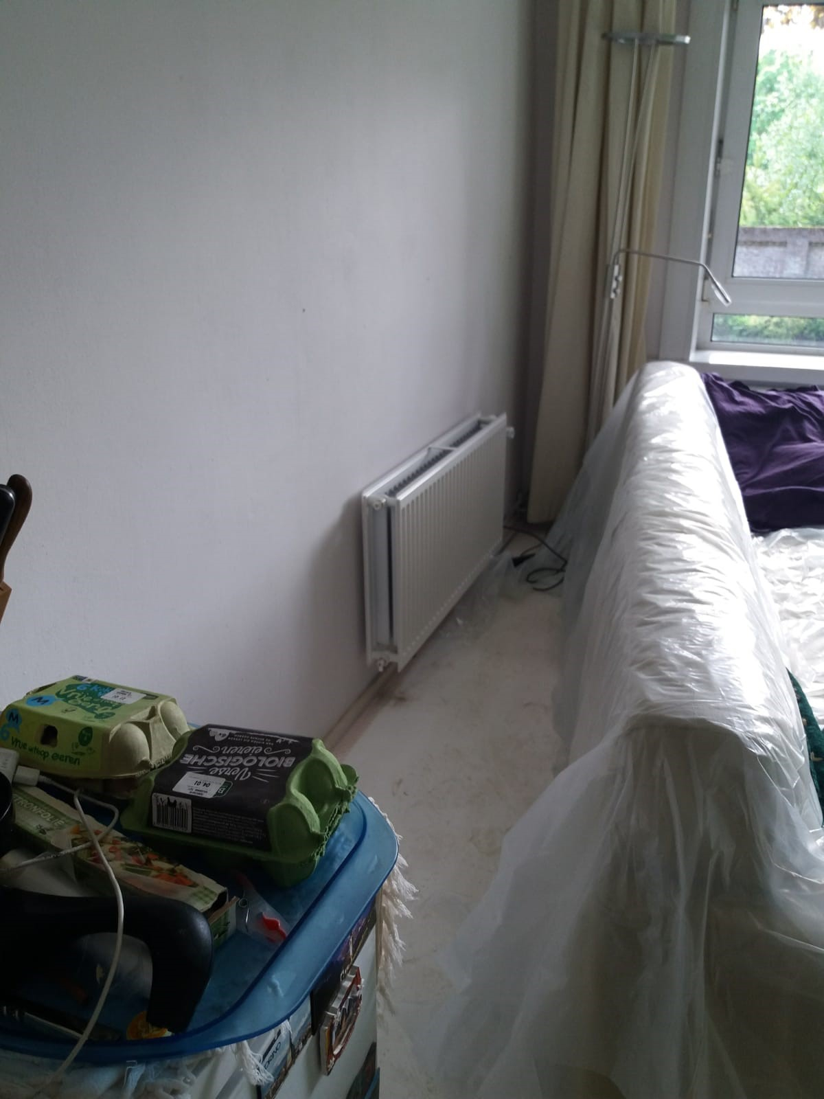 ''De wc en douche zijn vandaag betegeld. Morgen wordt het vloertje gelegd in de douche en wc. Verder voorbereidingen getroffen om de schoorsteen te verwijderen. Ze gaan het puin door het raam afvoeren en hebben alles wat nog in de kamer staat afgedekt met plastic. De enige schone plek in huis is de slaapkamer. Op 4 juni kan ik inductiekoken. O ja, ik heb gedoucht: heerlijk.''