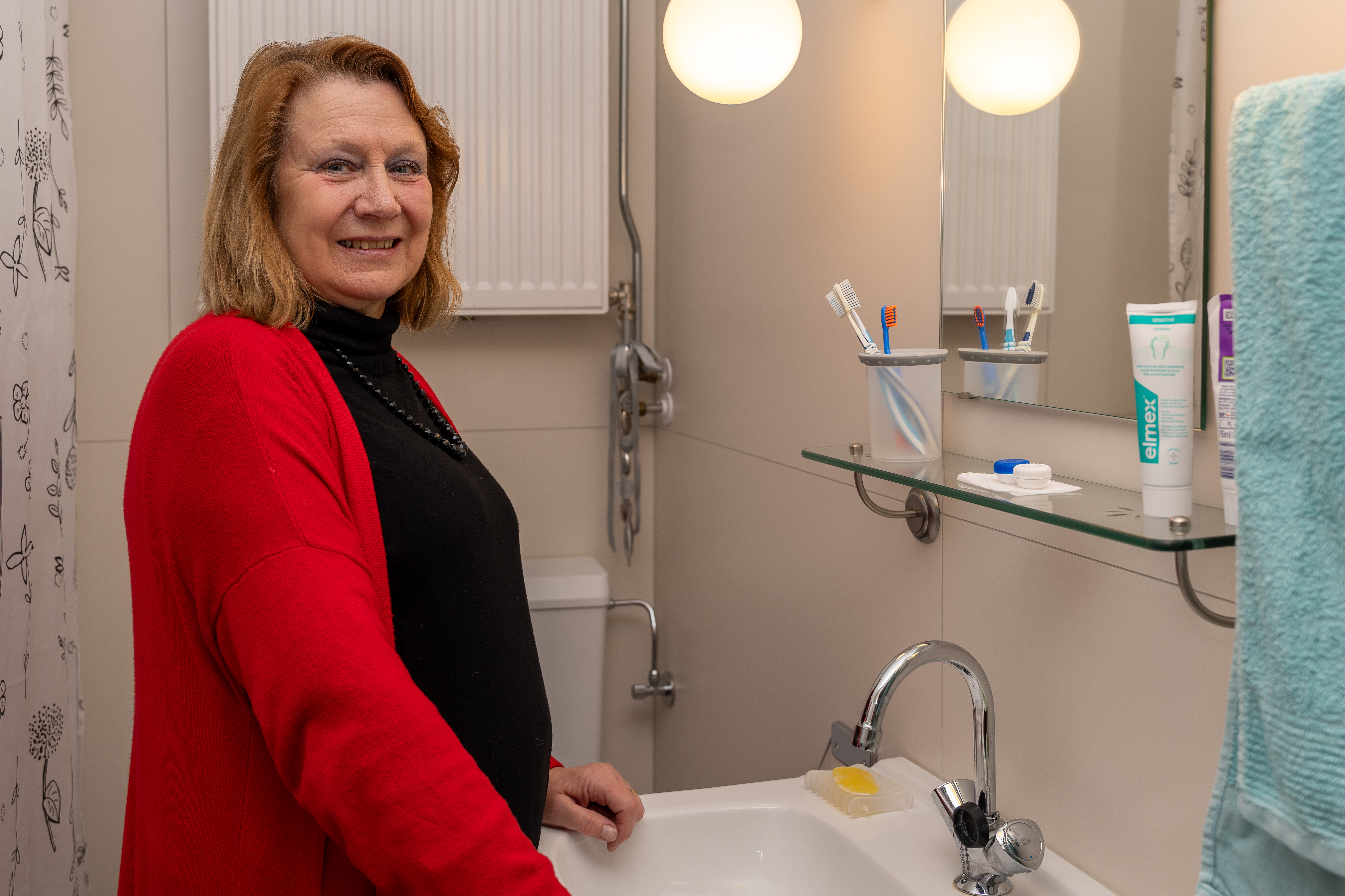 Jettie is vooral blij met de thermostaatkraan in de nieuwe badkamer: "Vroeger duurde het altijd even voordat het water op de juiste temperatuur was. Nu is het gelijk goed. Ook als je de kraan tussendoor even uitdoet. Dat is fijn. Zeker nu je een beetje zuinig aan wilt doen met gas. Ook in huis is het fijner. Door het HR++ glas en de nieuwe kozijnen tocht het niet meer. 's Avonds deden wij de thermostaat altijd op 16 graden. Als wij vroeger 's morgens beneden kwamen, was het ook echt 16 graden. Nu zakt de temperatuur niet meer onder de 18. Ook op zolder merk ik het verschil. Het kon daar vroeger steenkoud zijn. Maar door de dakisolatie doe ik daar nu graag mijn was."