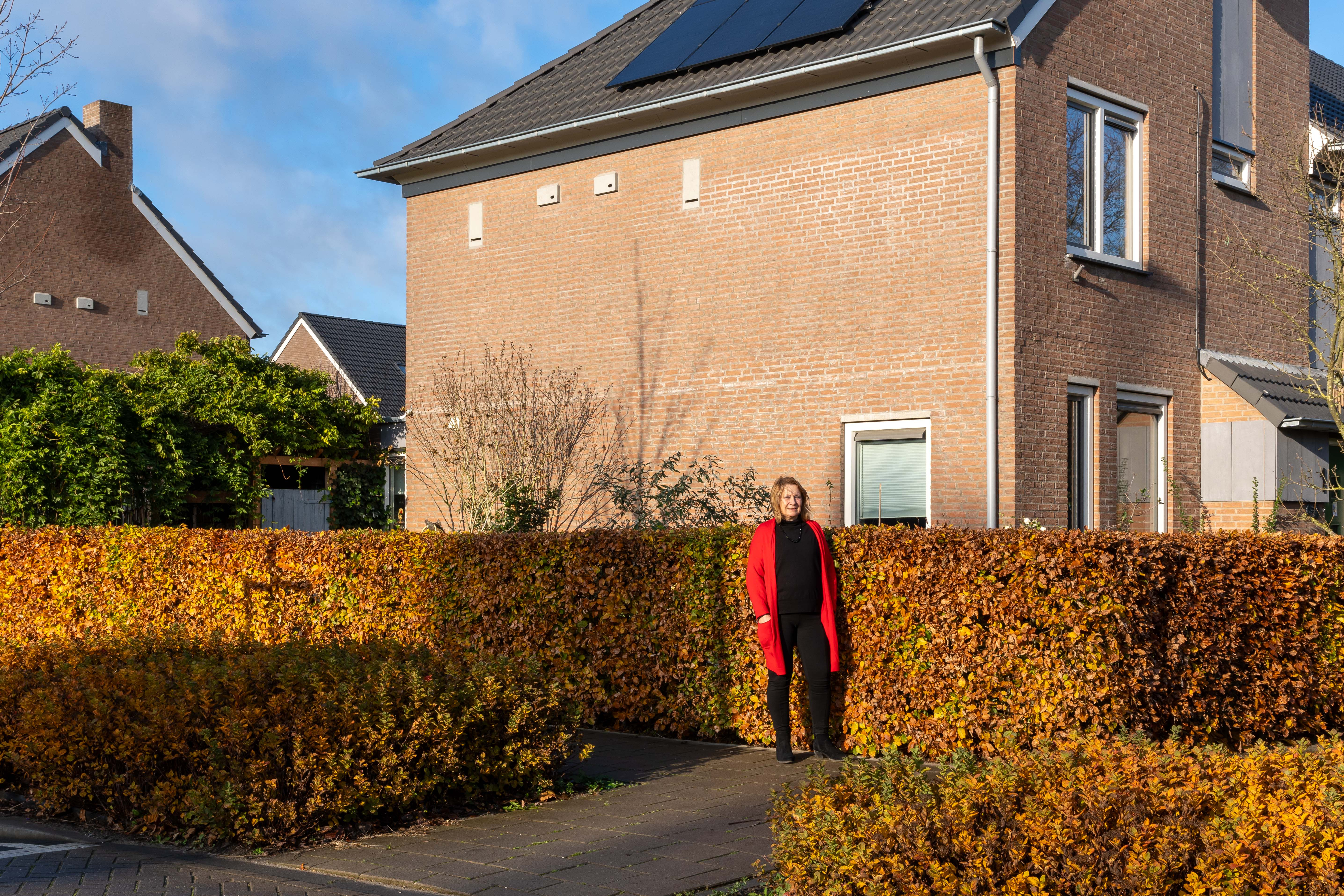 Jettie Luksemburg voor haar opgeknapte huis. Op de gevel hangen vogel- en vleermuiskasten