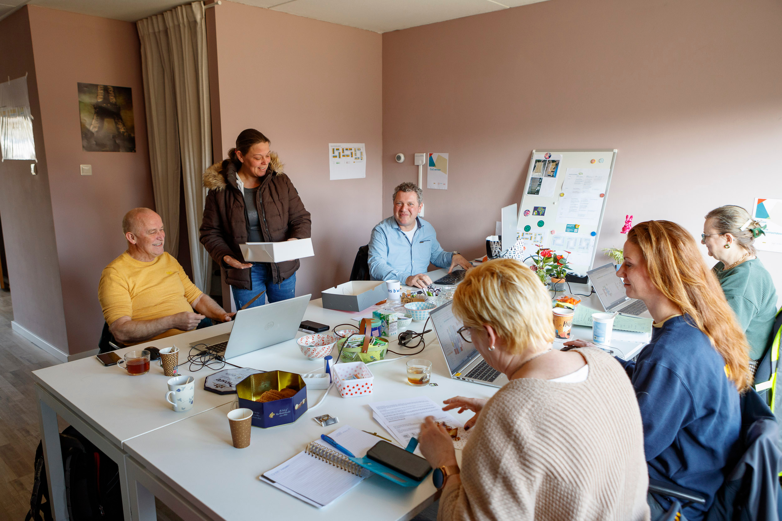 Sociaal projectleider bij Alwel, Bruno Gruijters, is in de projectwoning aan de Dingenadonk 3. Bij hem aan tafel zit Simone Visser, sociaal beheerder bij Alwel. Ze vertellen over dit intensieve project: "In oktober 2021 zijn we hier samen met aannemer Heijmans gestart. Steeds schuiven we een beetje verder door in de wijk. Zo zijn we nu bezig hier in de straat, aan de Dingenadonk. Halverwege 2025 is het project klaar."