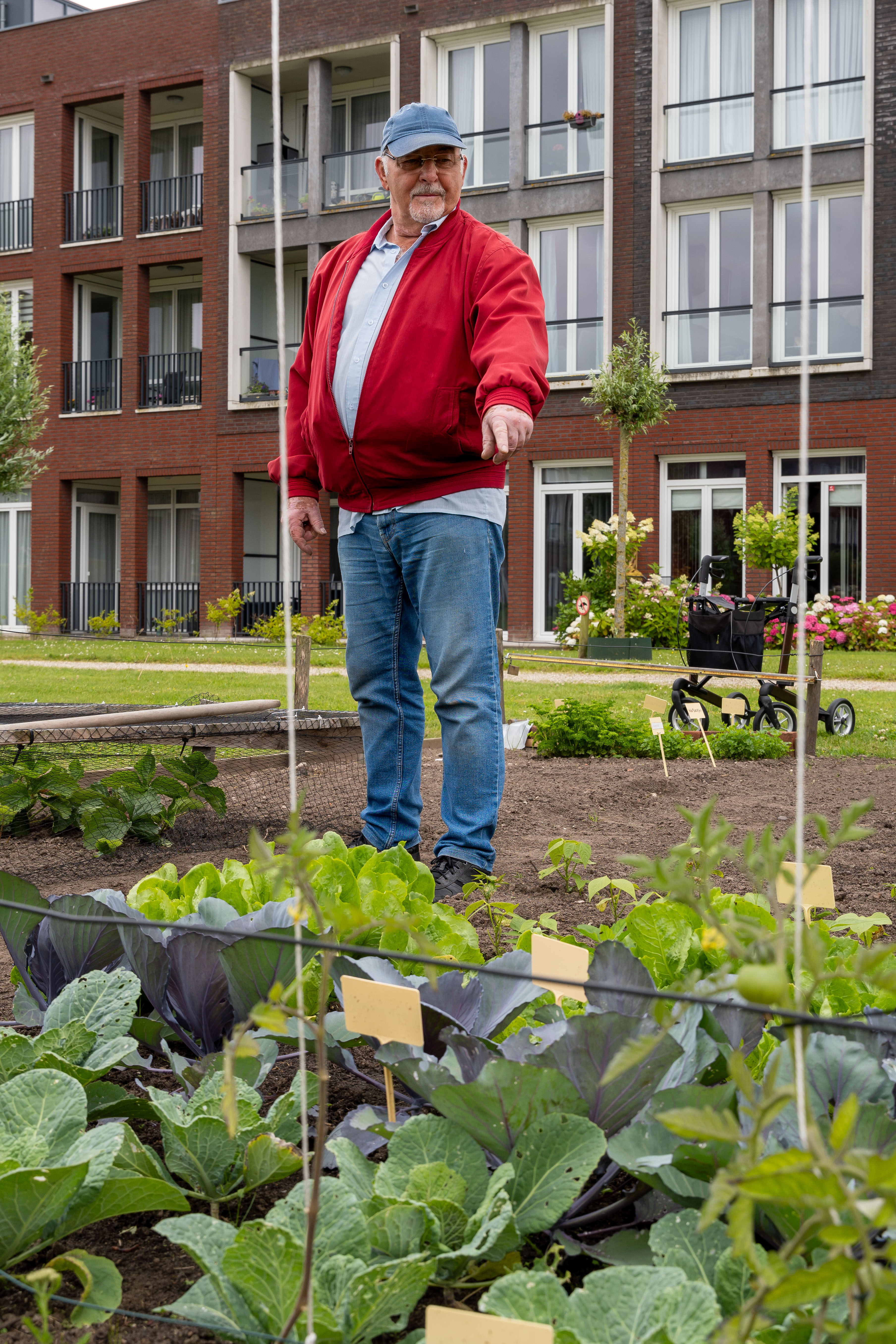 We lopen weer terug naar de grote tuin, waar meneer Voesenek (79) al op ons wacht. Hij kreeg ruimte om een moestuin aan te leggen. Van aardbeien, andijvie, kool, boontjes tot tomaten: er groeit van alles, maar onkruid is er niet te zien. "Ik doe elke dag een klein stukje. Zo blijf ik fit. Ik ga tot het laatst toe door", zegt hij trots.