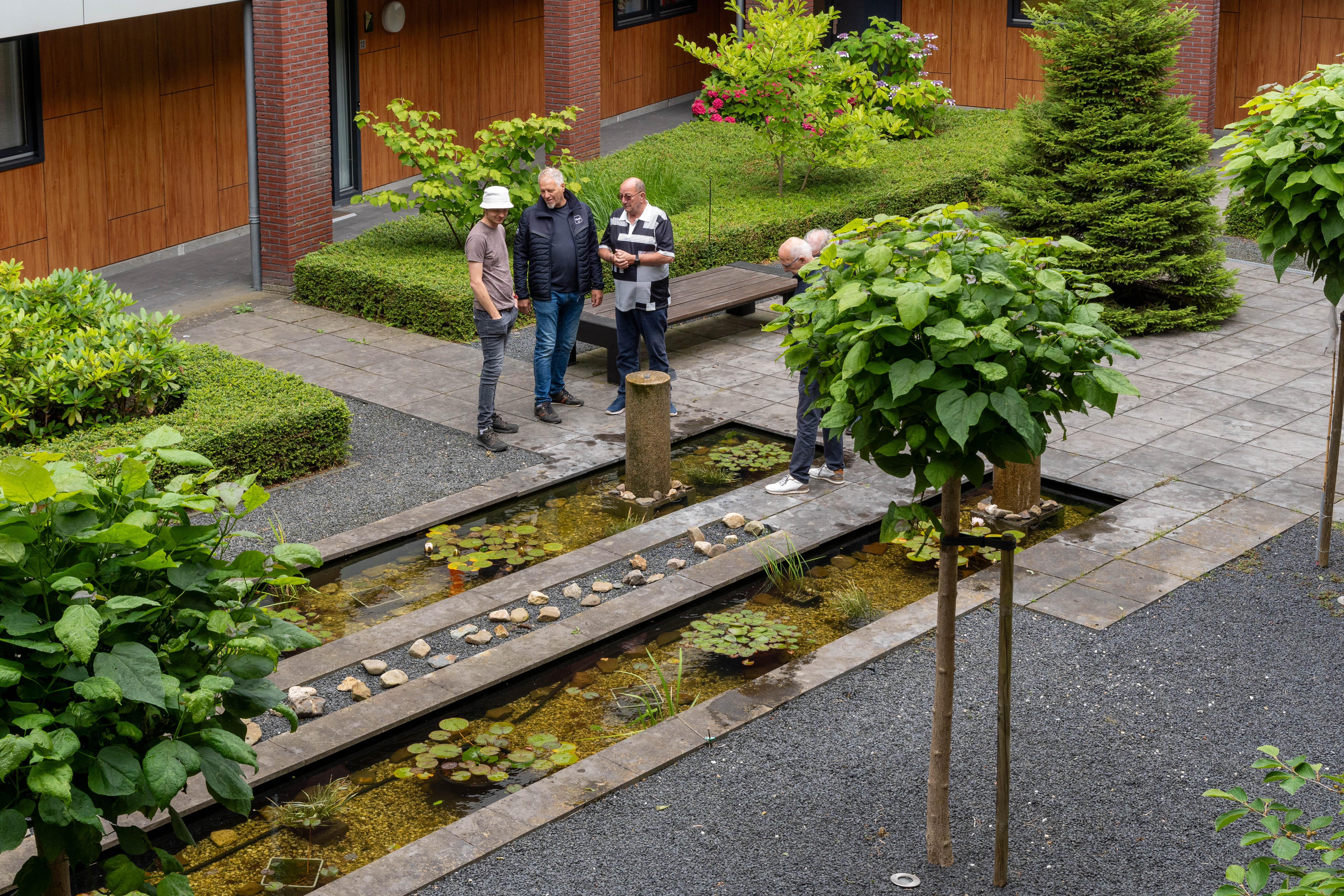 "Alwel stelde een budget vast voor materialen en planten. Als we iets nodig hebben, regelen we dat direct met Braat. Braat houdt bij of het volgens afspraak is en binnen het onderhoudsbudget valt. Zo kregen we een nieuwe waterpomp, omdat de oude stuk was. Ook de waterlelies die nu zo mooi bloeien, kregen we vanuit dat budget." De binnentuin is een fijne ontmoetingsplaats voor de bewoners. "Iedereen groet elkaar hier. Ook is er ieder jaar een barbecue voor het hele woongebouw. Daar gaan vooral de mensen die hier langer wonen graag naartoe", zegt meneer Lens.