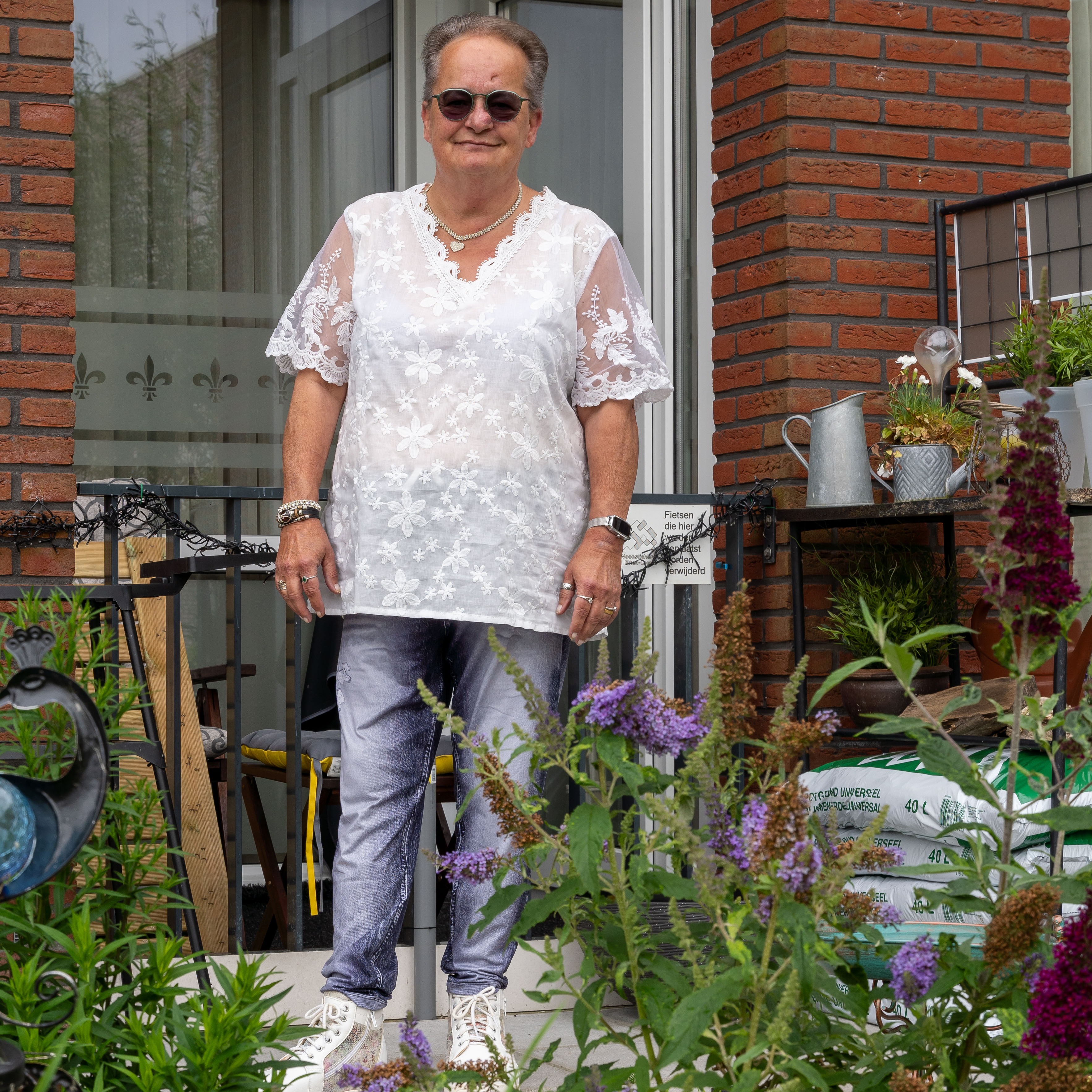 We maken nog een laatste stop bij mevrouw Huynh-Vo en haar buurvrouw mevrouw Hens. Dankzij de terrassen voor de appartementen, lopen de buurtjes gemakkelijk naar elkaar voor een praatje. Ook zij hebben ieder een eigen tuintje. Mevrouw Huynh-Vo houdt van kruidig en pittig eten. Zij kweekt kruiden, tomaten en pepers in potten op het terras. "Het wil het allemaal niet zo goed doen deze zomer. Maar zodra het wat beter weer wordt, zet ik de planten over in de tuin", zegt ze. Mevrouw Hens is ook blij met haar tuin. Bloeiende hortensia’s en vlinderstruiken maken het tot een vrolijk geheel.