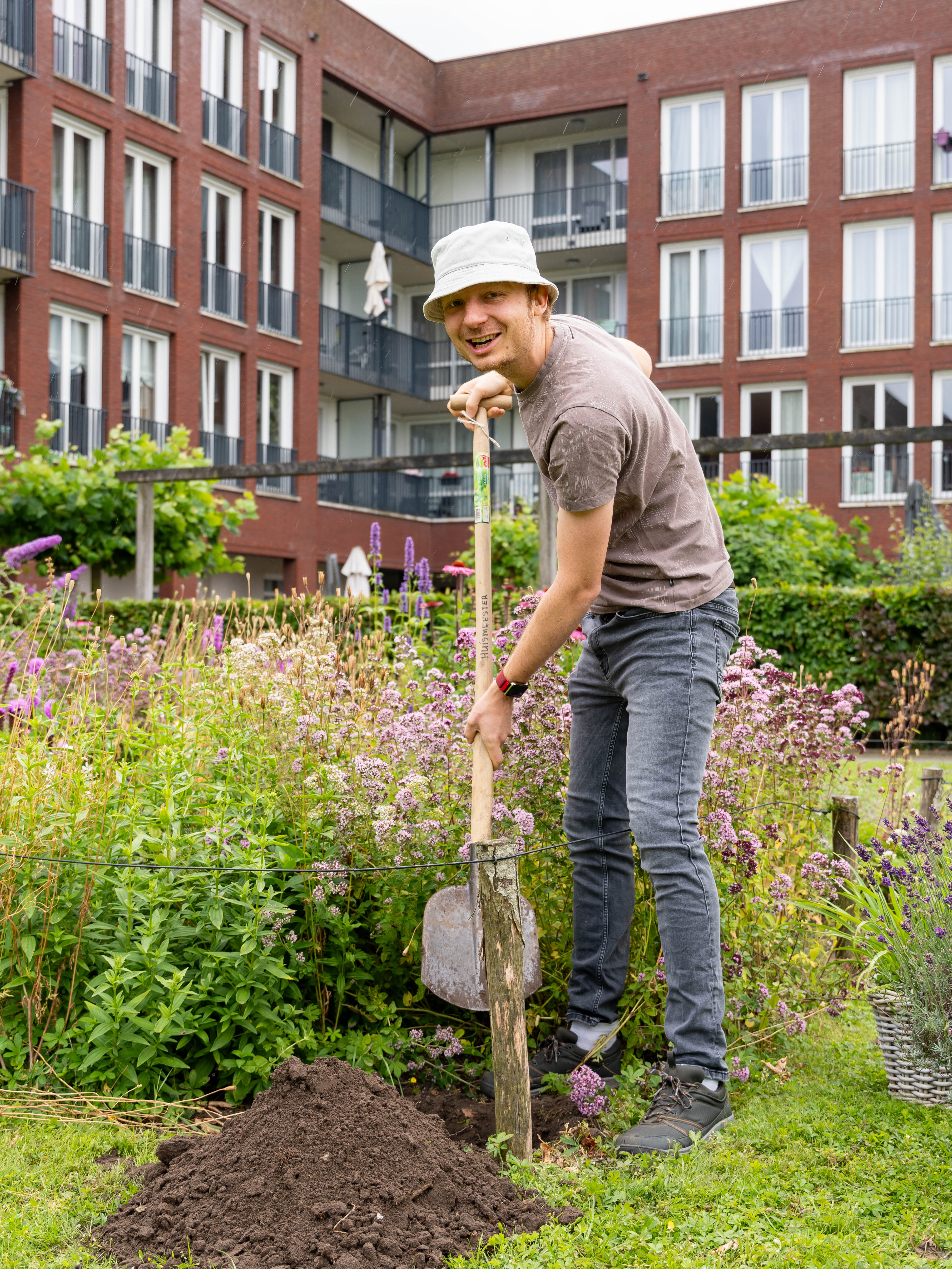 Weer of geen weer, in de tuin bij woongebouw Contrefort in Etten-Leur zijn altijd bewoners met groene vingers te vinden. Sociaal beheerder Jan Braspenning geeft hen de ruimte en de middelen om een eigen tuintje aan te leggen en te onderhouden.