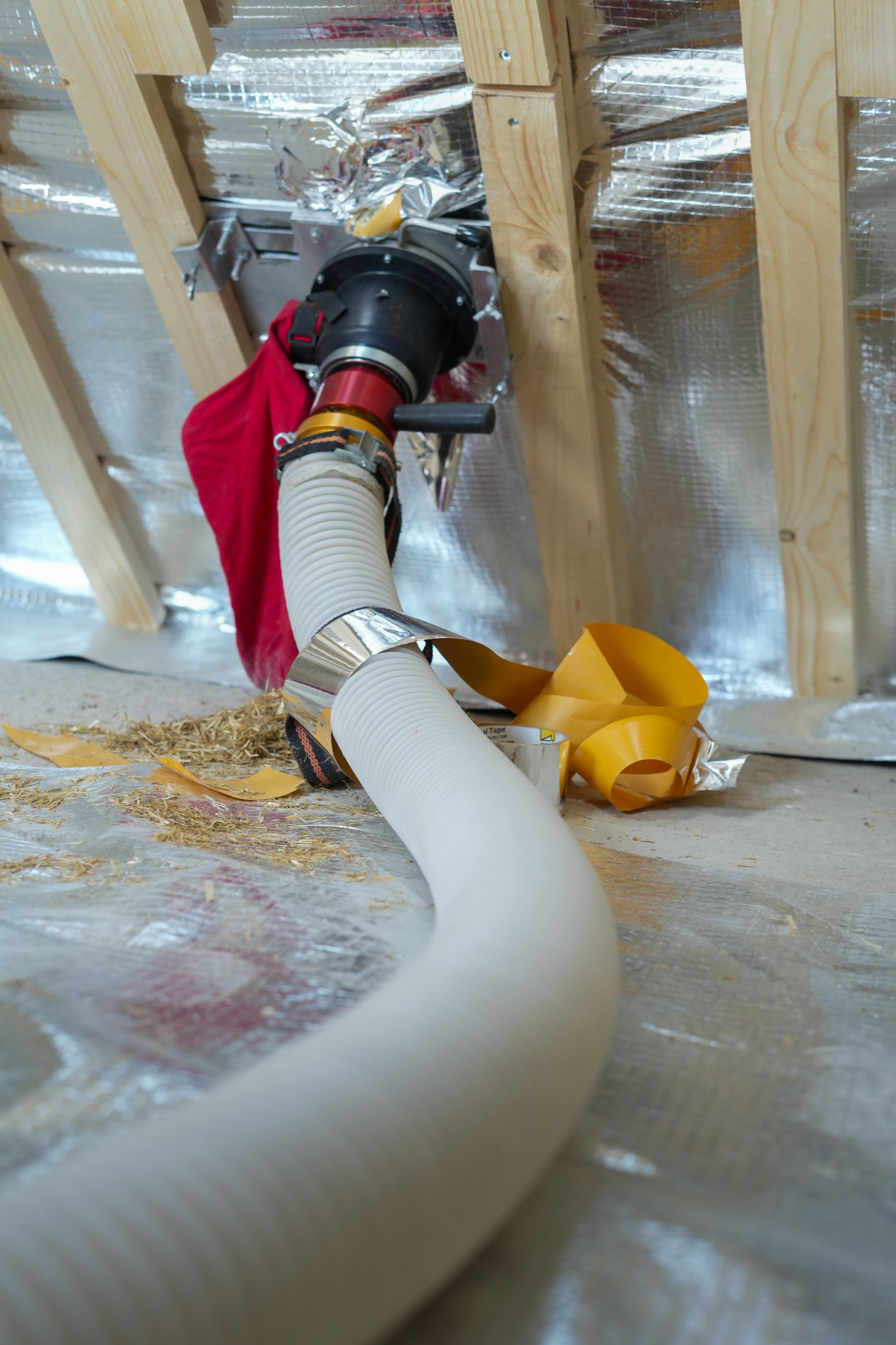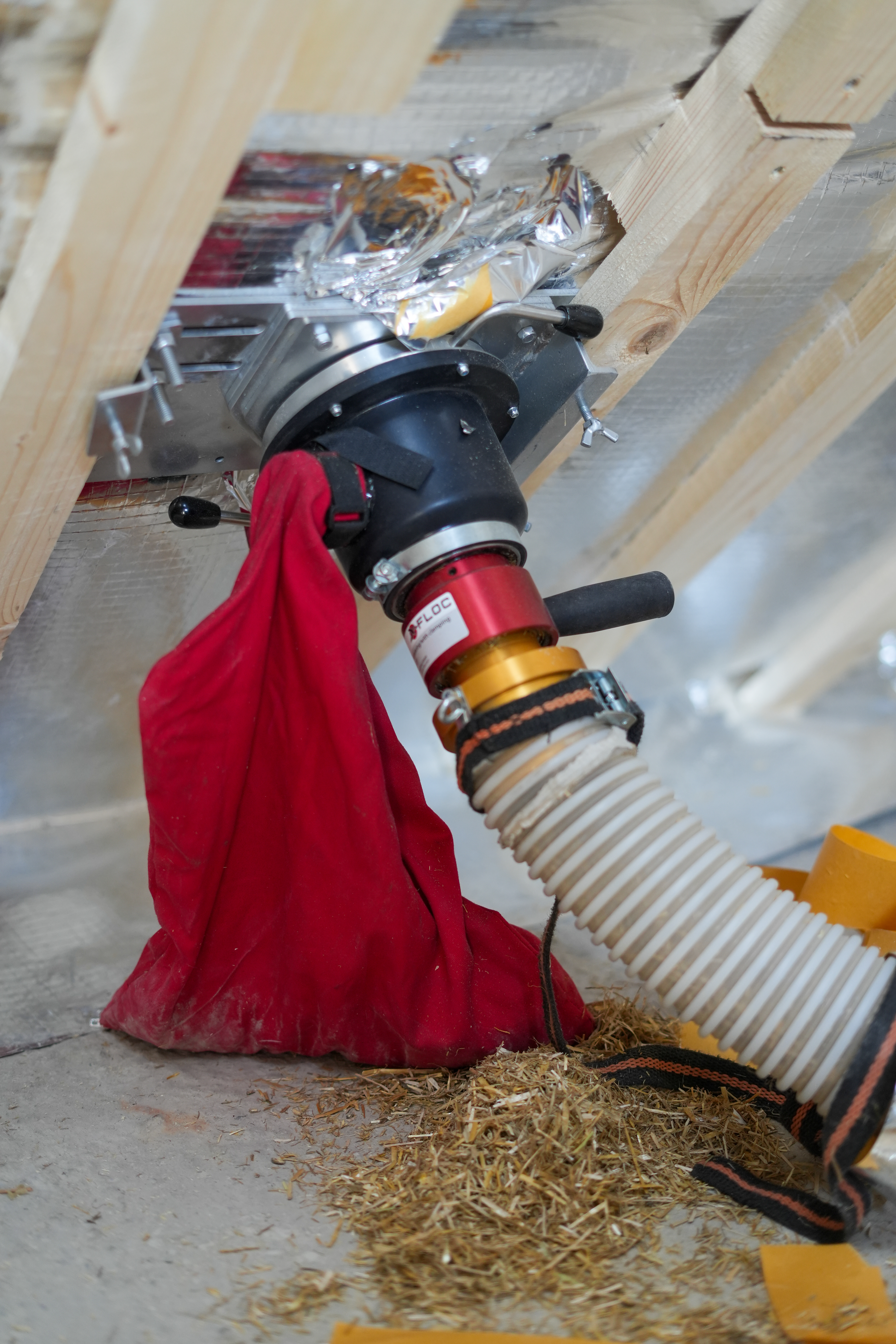 Via lange slangen wordt het stro in het dak van de woning geblazen