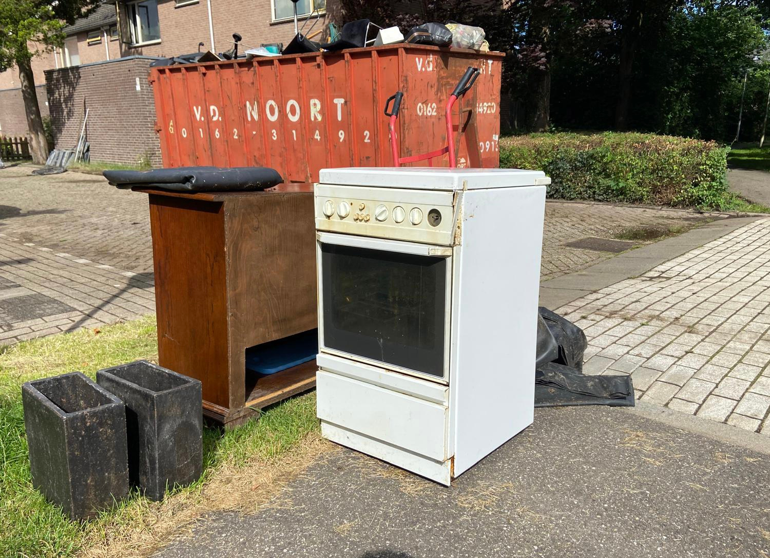 Bewoners van de Klaroenring in Etten-Leur begonnen 's ochtends al vroeg met het weggooien van oude spullen. Vanaf 8 uur was er volop activiteit. Binnen no-time zat de eerste container vol. En dus regelden we dat een tweede container zou komen. Ook de mensen van Ons Label Breda hielpen de bewoners een handje met sjouwen.